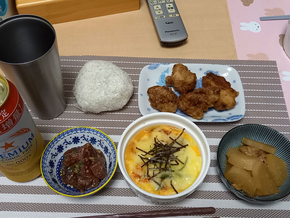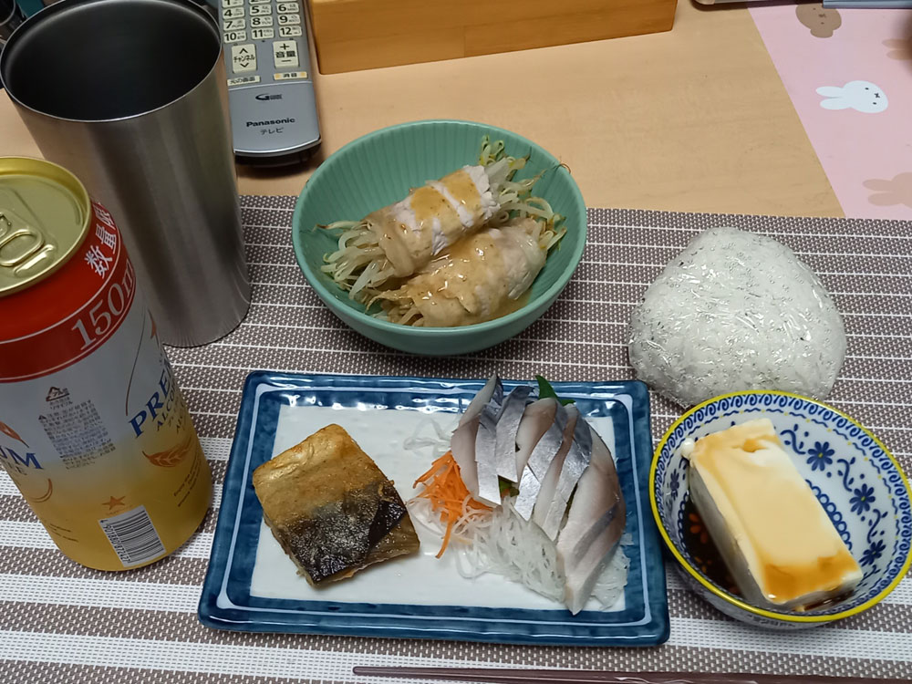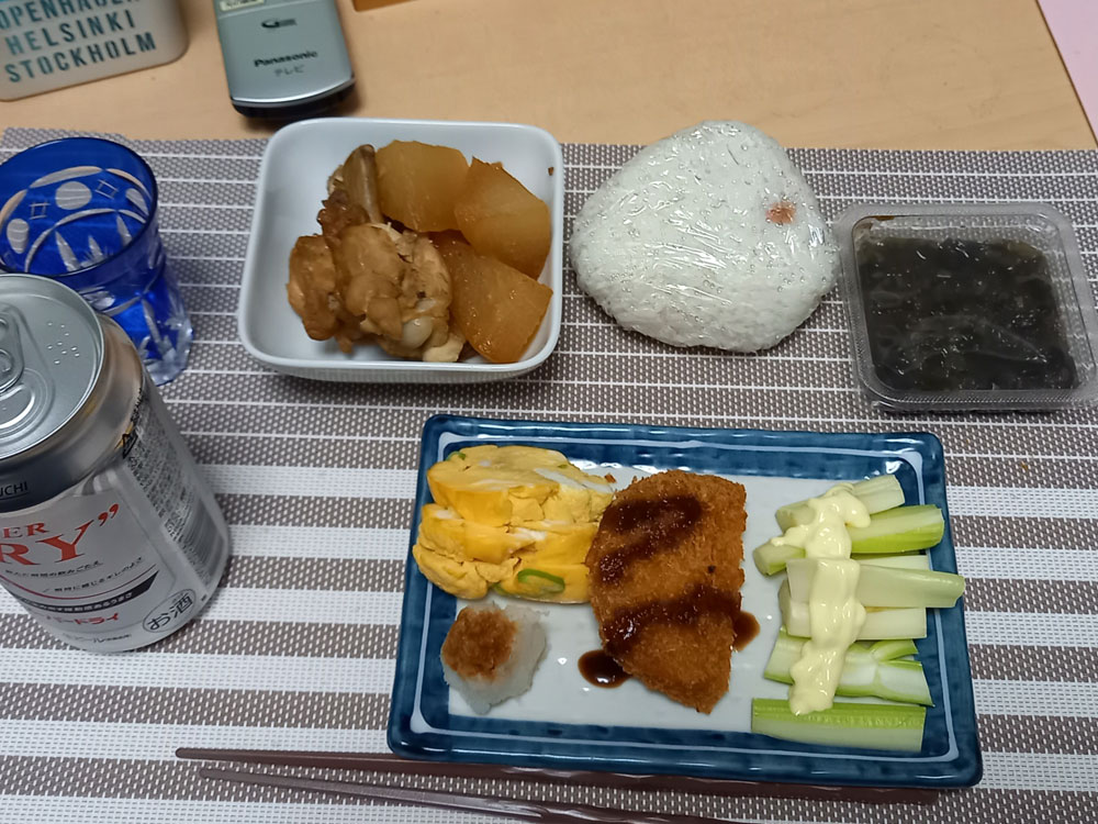 今日は親戚に行って遅くなったのでスーパーから購入したお惣菜と、弁当です。
